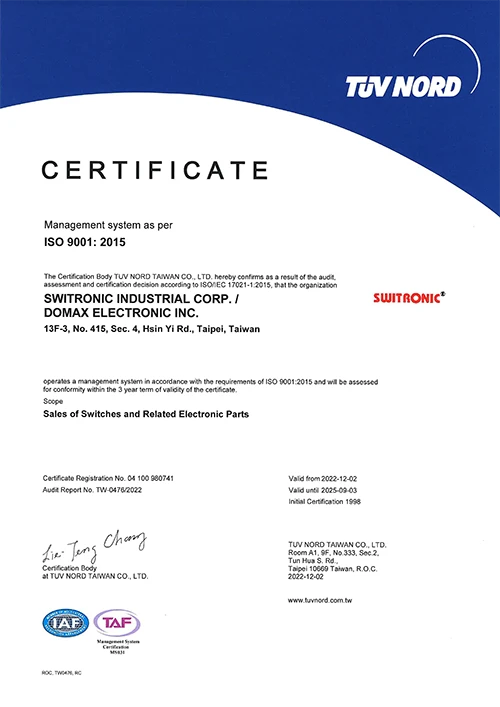 一綺電子為ISO 9001品質認證之公司,所有產品皆符合綠色環保規範。我們以嚴謹的品質管理,確保每一顆開關皆達到最高標準。