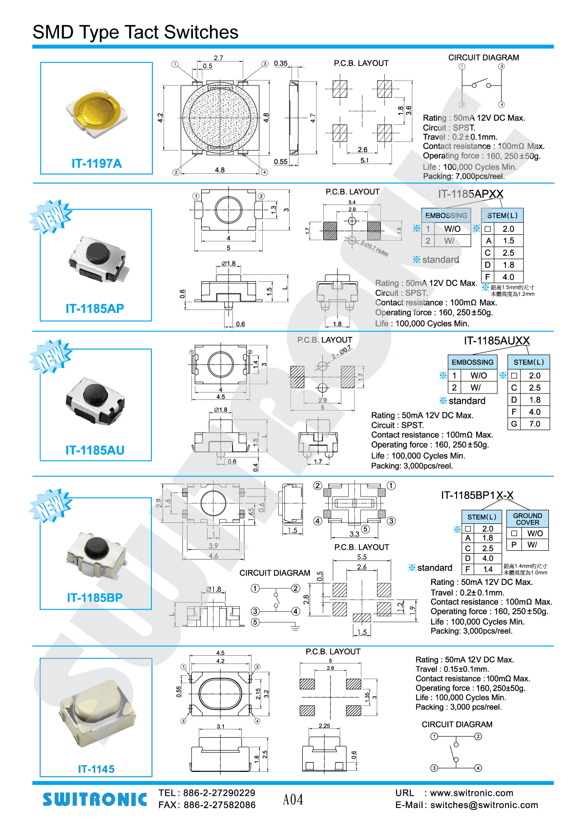 IT-1185BP1-160G-G 按鈕高度:2.0mm 按壓力:160g 行程:0.2mm 電壓:12V DC 電流:50mA 製程加工:貼片式 端子腳型式:歐翼型端子腳 有無定位柱:無 有無地線:無
